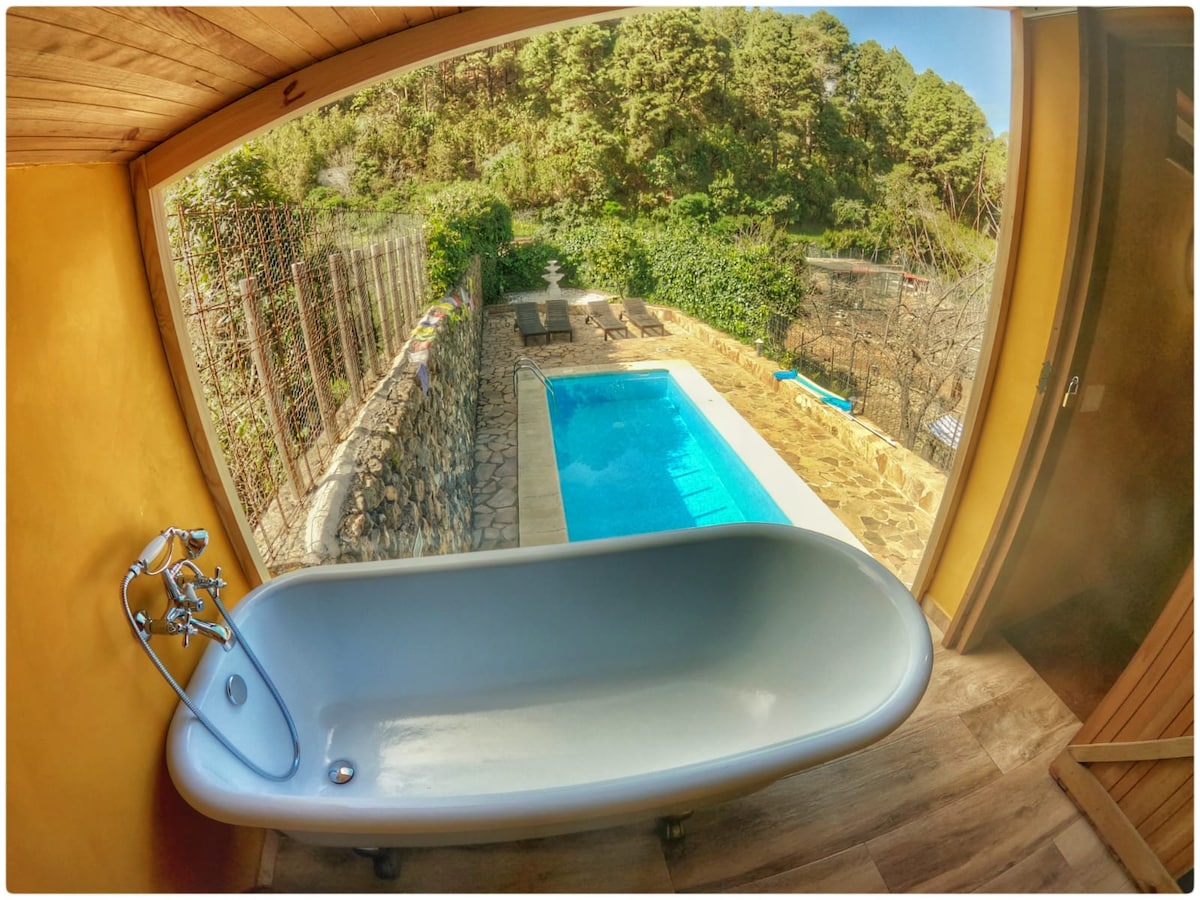 ¡Bienvenidos a nuestra joya en la montaña! Descubran nuestra casa, en una finca privada a 1000m de altitud, rodeada de arboleda y frutales. El sendero GR les espera a pocos pasos, ideal para deportes y paseos. Podrán disfrutar de un baño en nuestra encantadora charca con vistas inigualables al Teide. ¡Descubran la magia de la naturaleza desde la comodidad de su hogar temporal!