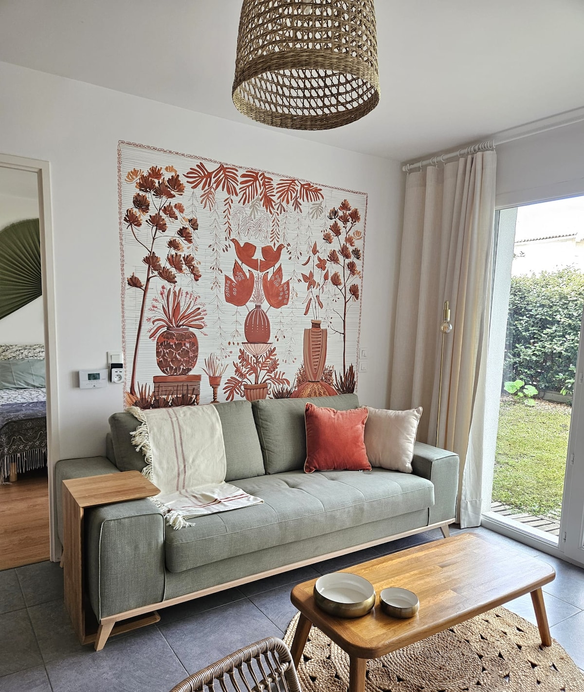 Studio douillet et tout équipé, pour 2 personnes, placé en hyper centre avec marché couvert et commerces, avec un grand lit de 160, une déco bord de mer nature, un équipement complet et confort, cuisine, lave vaisselle, plaque induction, four, lave linge, douche italienne, grand placard d'entrée, terrasse, les plages océanes et la dune à 15 mins. Moins de 4 nuits, Les draps et serviettes ne sont pas fournis, possibilités de louer un kit pour 15€ draps et serviettes à demander avant l’arrivée.