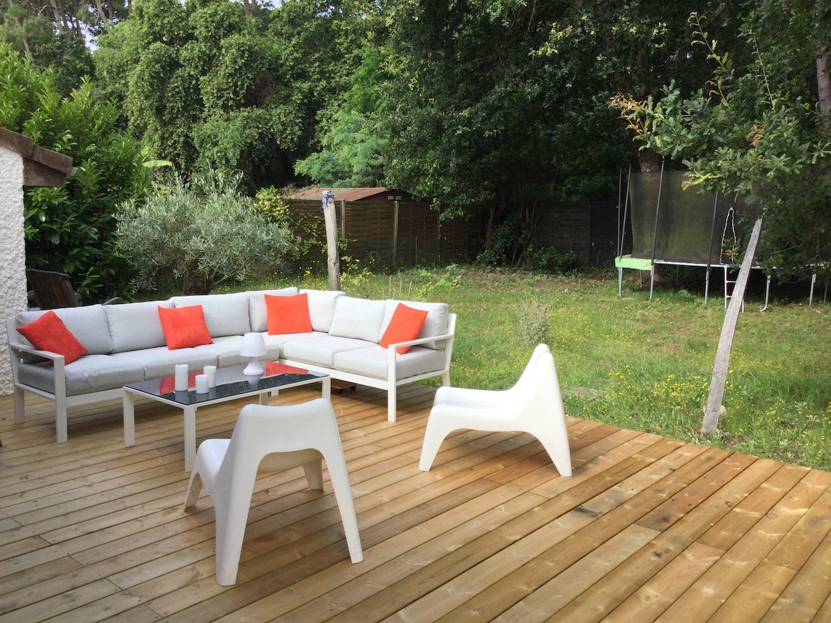 Maisonnette située au coeur d'un grand jardin arboré, au calme, à proximité de la piste cyclable, des forêts, de l'eau-baignades - plages océanes & plages du bassin, activités nautiques, ports ostréicoles & de tous commerces. Terrasse ombragée & hamac. Confort : linge de lit, de toilette, de cuisine & vélos à disposition. Accueil jusqu'à 3 pers. Bb/enf. bienvenu. Télétravail : bon réseau wifi (routeur). Accès facile Arcachon & Bordeaux. A l'envie, petit déj' à la carte en supplément sur place.