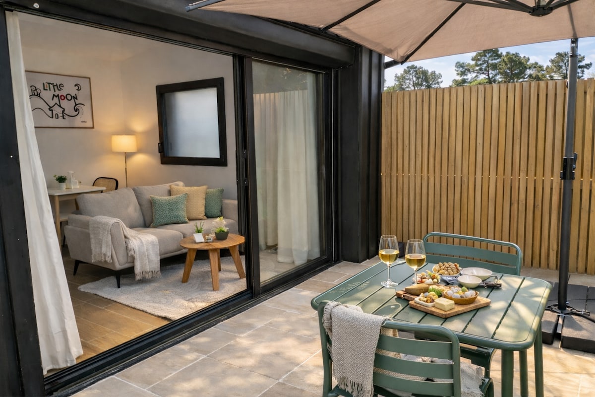 Petite maison de 60m2 tout équipée ,située dans une copropriété très calme à 300 m du port de la Teste , idéal pour se ressourcer . accolée au sentier du littoral : pas de vis à vis , une belle terrasse ensoleillée sud -est entourée de verdure: soleil matin et jusqu’au début de l’après midi. Un petit insert à bois en fonction pour les flambées du soir d’hiver ou de la mi saison apporte la touche romantique du feu de bois. Wi fi , terrain de tennis et de pétanque Parking extérieur .