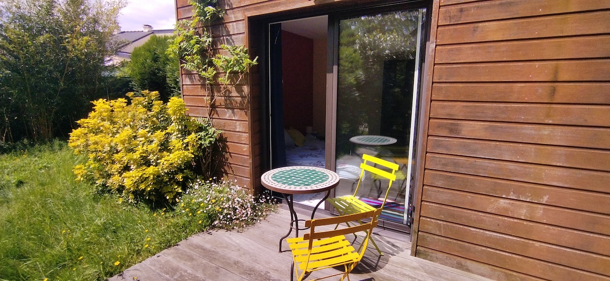 Entourée de verdure, venez découvrir au RDC d’une maison d'architecte un appartement de 42m² profitant d'une grande terrasse avec son jardin privatif exposé SUD sans vis à vis tout en étant à proximité de la rocade (2 minutes) et 10 minutes du centre ville de Rennes. Une chambre avec un lit queen size (160/200) avec armoire. Séjour : table avec rallonge, salon TV avec 2 canapés dont un canapé/lit avec un vrai matelas. Une boite à clé vous permettra d'arriver et de repartir en autonomie.