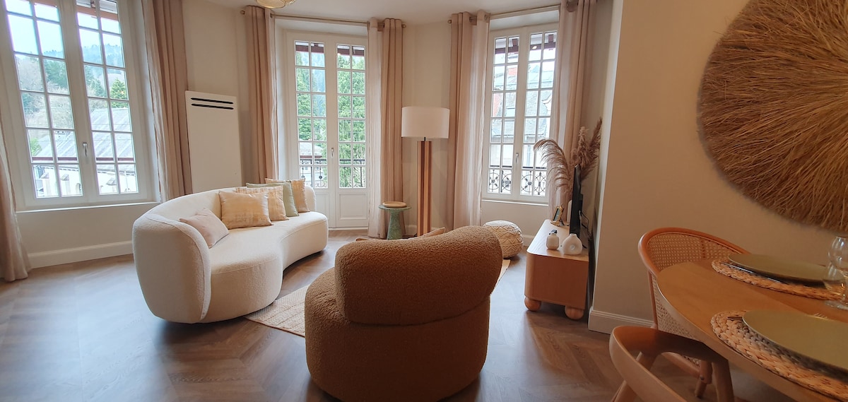 Appartement de charme à La Bourboule. Entièrement rénové, classé 4*, ce logement vous permettra de passer un sejour des plus agréables dans un quartier calme et ensoleillé. Proche de la ville (5mn à pieds) ainsi que de toutes les activités plaisantes de la région (randonnées, piscine, lac naturel, activités sportives de montagne telles que le ski ou la luge d'été). Cure. Vous pourrez séjourner à 2 ou 4 personnes dans cet appartement bénéficiant d'une chambre avec un lit double et un canapé lit