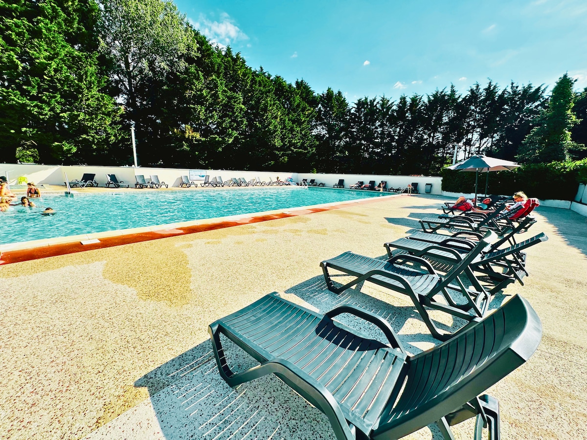 Emplacement n° 1 dans le camping, face à l'aire de jeux et à la piscine, proche du toboggan aquatique et du restaurant. IDEAL FAMILLE! Vous pouvez surveiller vos enfants depuis votre terrasse. Traversez simplement l'aire de jeux pour accéder à la piscine, à quelques dizaines de mètres du mobil-home. Veuillez noter que le linge de maison n'est pas fourni. Réservez dès maintenant pour des vacances inoubliables en famille