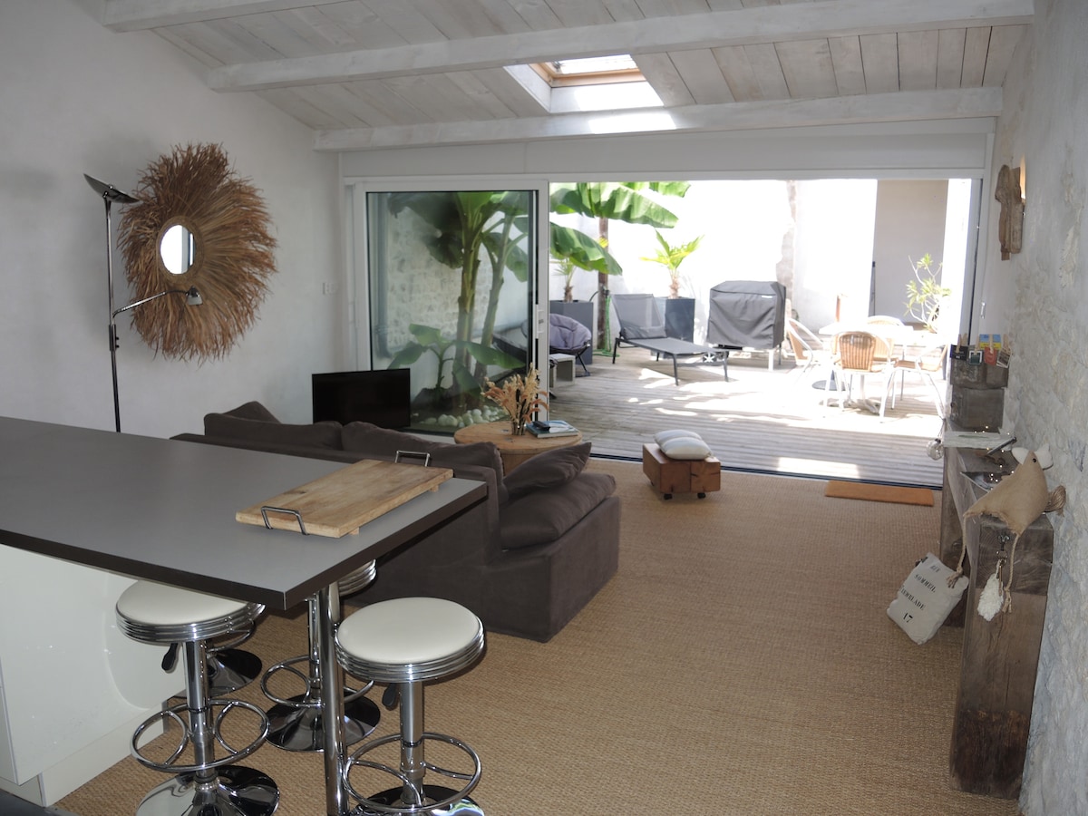 Ancien chai rénové en habitation avec tout son confort : Aucun vis à vis, belle chambre (lit hôtelier 160x200) avec douche à l'Italienne, grandes baies vitrées, cuisine entièrement équipée, lave-vaisselle. Linge de lit , linge de toilette, torchon, foutas plage inclus. C'est un véritable 'nid douillet', au calme, ensoleillé, belles prestations et emplacement privilégié au cœur du village. Endroit atypique, idéal couple. Pour des vacances de rêves, du repos.
