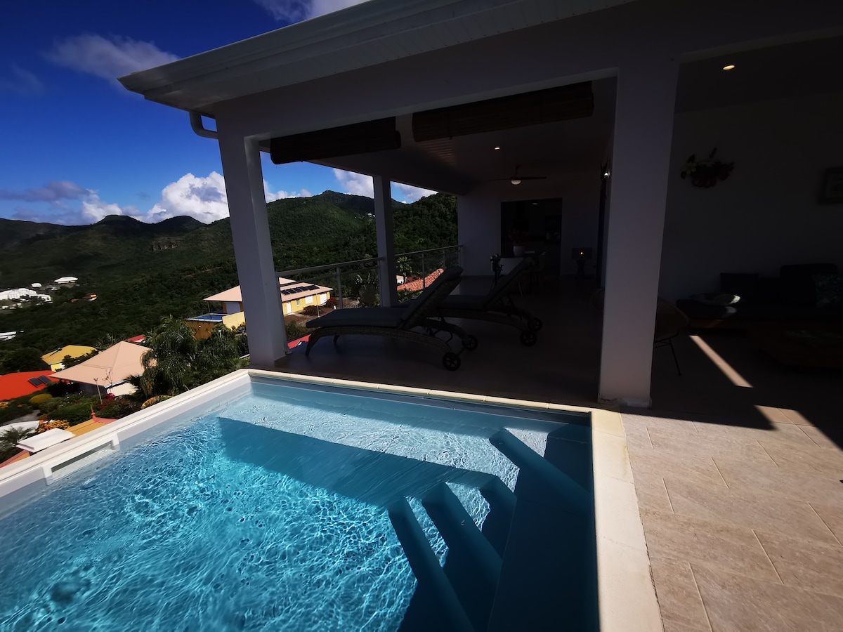 La villa Amara 3 est une villa luxueuse toute neuve et très spacieuse. Située en haut d'une colline dans le Domaine d'Amara, la vue à 180° sur la mer des Caraïbes y est incroyable. La villa construite en 2025 est très grande (500m2) avec une immense terrasse de 200m2 et une piscine à débordement de 11m x 4m d'où l'on peut voir chaque soir le coucher de soleil sur la mer ! La villa meublée avec goût, moderne et fonctionnelle, comprend 4 grandes chambres, chacune avec salle de bain privée.