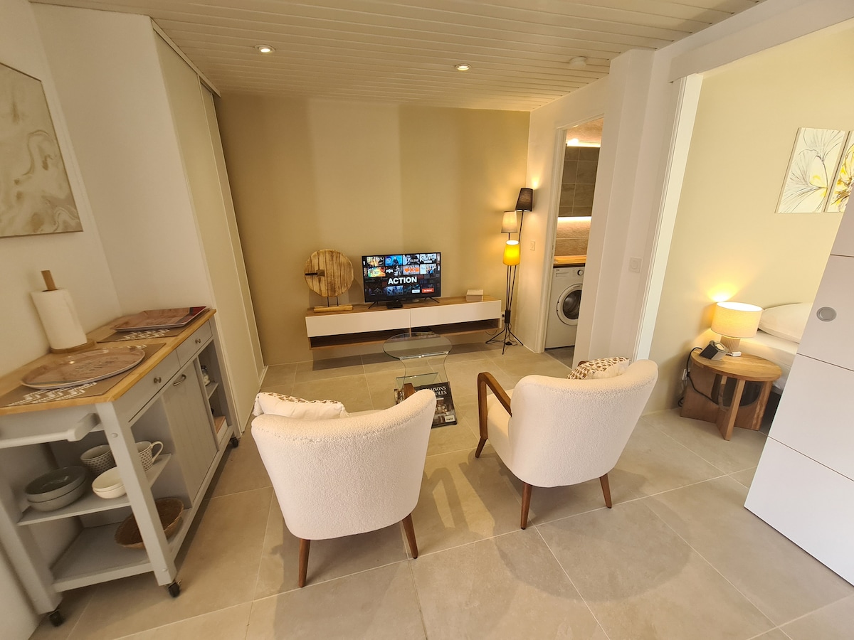 Détendez-vous dans ce logement calme et élégant. Une véritable suite avec son lit en 160, sa salle de bain élégante, son vrai salon, et une cuisine toute équipée. Vous apprécierez aussi le salon en véranda, et adorerez la terrasse et son deck pour y partager vos repas. La terrasse est abritée et un peu à l'écart ; parfait pour se prélasser sur les chaises longues.