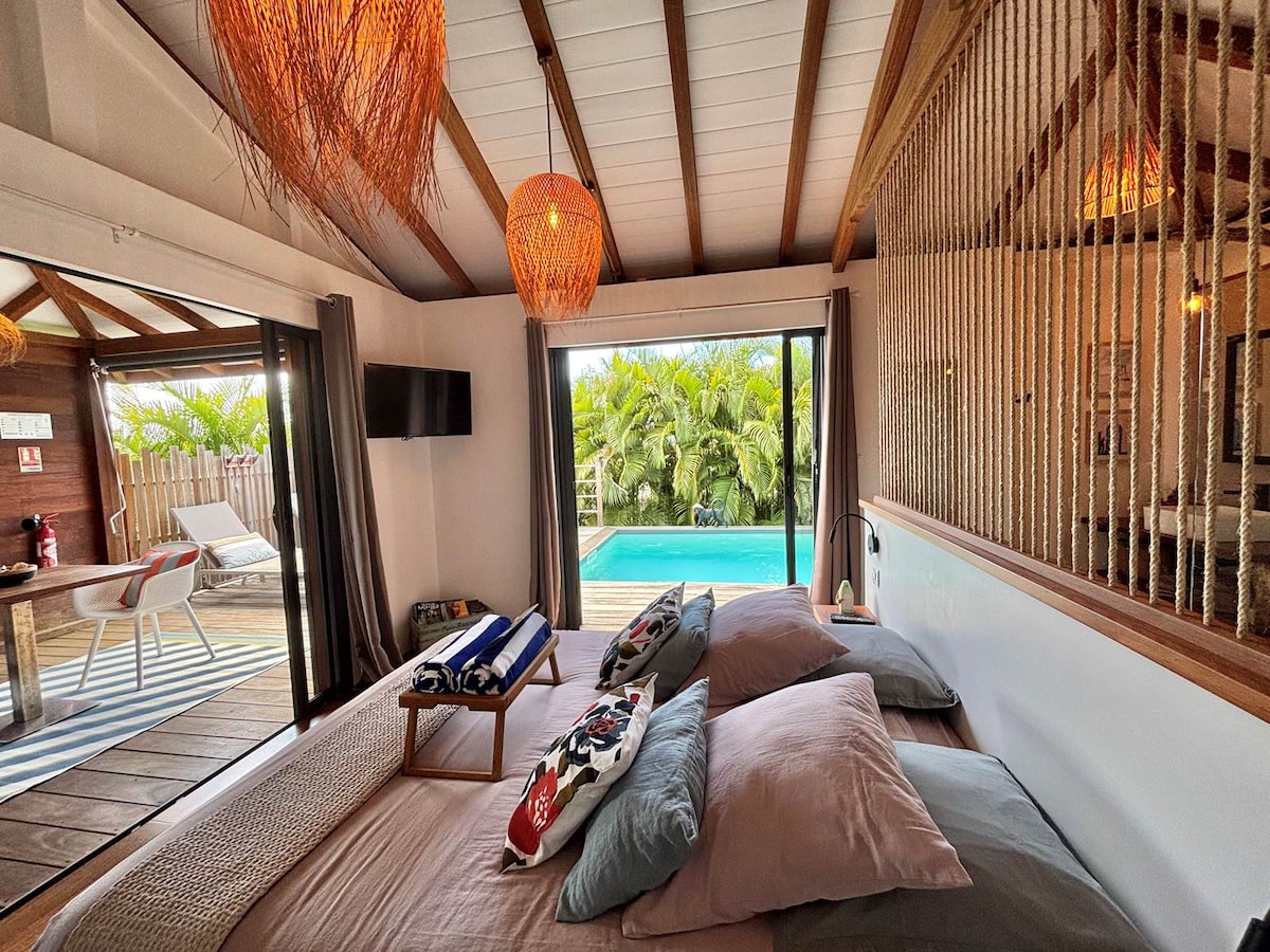 Our Ti surf Lodge is a bungalow for two people nestled in the heart of the tropical vegetation, in the municipality of Le Diamant. Entirely made of exotic wood, the lodge is relaxing and unique... With its private pool, you can rest and relax while enjoying the sunbathing. Covered outdoor kitchen, air-conditioned bedroom with TV and Italian bathroom. Separate toilets. Private entrance with secure parking space.