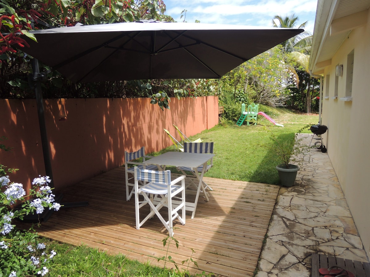 L'appartement est situé à Tartane dans un quartier calme, entre l'Anse Bonneville et l'Anse l'Etang, au RdC de notre maison. Il est composé d'une chambre climatisée, d'une salle de bain et d'un espace cuisine-salon. La terrasse, couverte, donnant sur un délicieux jardin tropical, prolonge la vue mer qu'offre l'appartement. Un chemin d'accès d'environ 80 m mène directement à une charmante petite crique. La plage des surfeurs (5') et le Parc Naturel sont accessibles à pieds également.