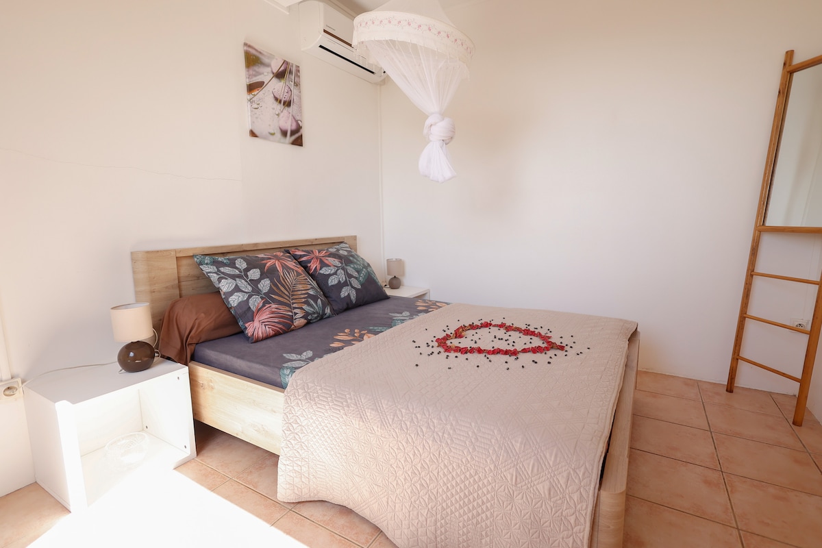 Mon logement est proche de la plage de Cosmy et du centre de la ville de Trinité et offre la possibilité de profiter d'activités adaptées aux familles. Vous apprécierez mon logement pour son emplacement , la quiétude , et la vue qu'il offre . Vous disposerez de tous les équipements nécessaires ( vaisselle, fer à repasser , linge de maison c'est-à-dire torchons de cuisine , serviettes de toilette) . La chambre est climatisée. 5 nuits minimum.