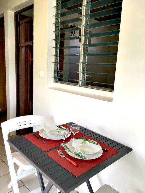 1 lit double climatisé, ventilé, étagères, penderie; TV plat, Wifi, Kitchenette: hotte, cafetière, grille-pain, cuiseur, réfrigérateur Coin repas sur balcon avec magnifique vue mer. Lavabo, douche et WC; Linge de maison (1 grande et 1 petite) serviette en dépannage, location serviettes supplémentaires, peignoirs et sèche-cheveux à la demande Lave-linge extérieur partagé, Terrasse couverte accès piscine, bbq, cuisine extérieure : four, grill, crêpière à la dde NON FUMEUR Intérieur & ext.