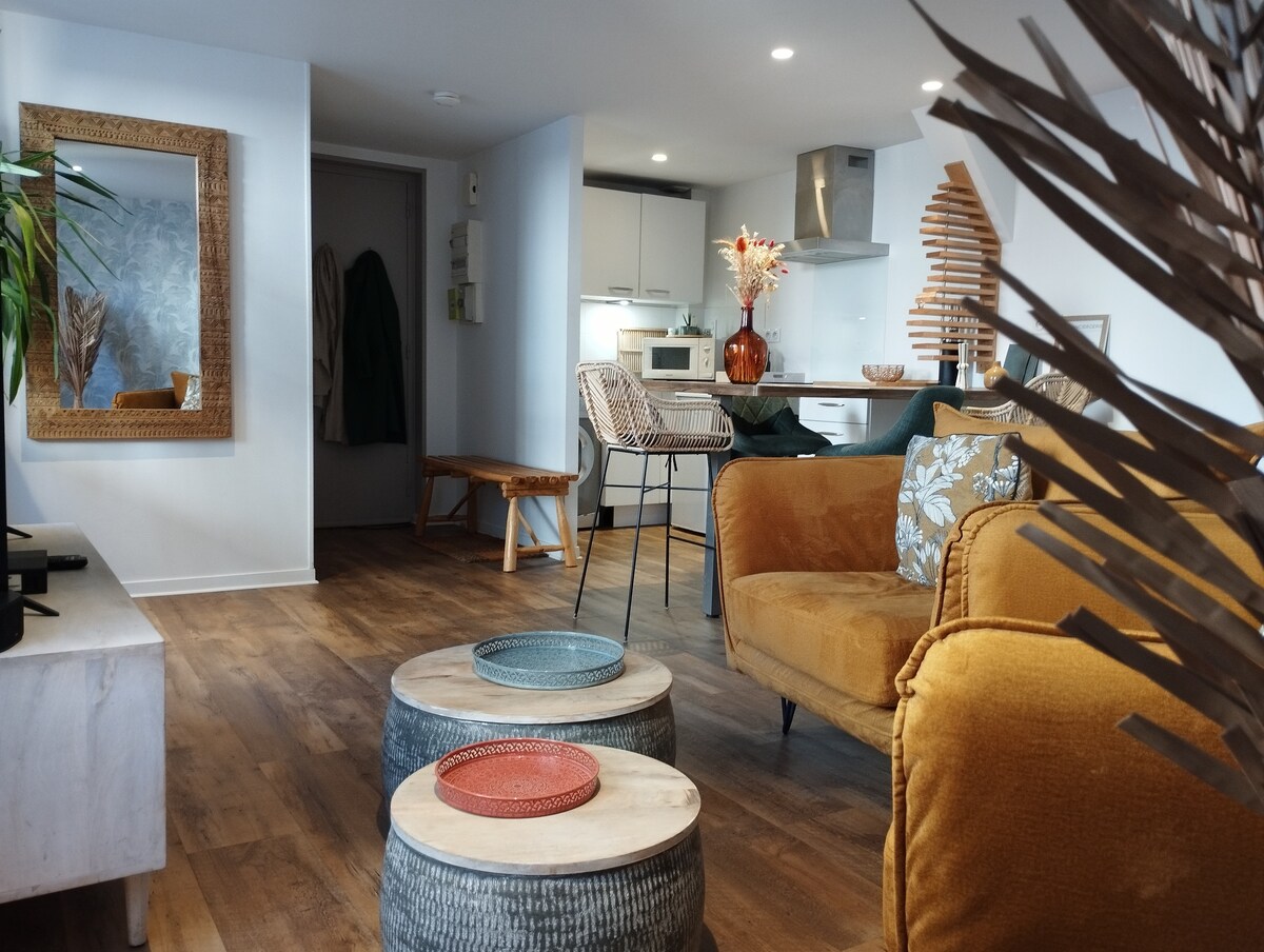 2 VELOS (1 VTC femme et 1 VTC Homme ) - jusqu’au 08/11/2025 et à partir du 06/04/2026 T1 bis de 24 m2 3 étoiles Plages et commerces à pied (250 m) 1 place de parking réservée Cuisine entièrement équipée: plaque à induction, four/micro-ondes, lave-vaisselle, Nespresso… Espace nuit indépendant : lit gigogne 2 matelas de 80*200 (de même hauteur formant un grand lit) Pièce de vie: canapé convertible 2 places SMART TV Lave-linge Jardin clos 36 m2 exposé Sud