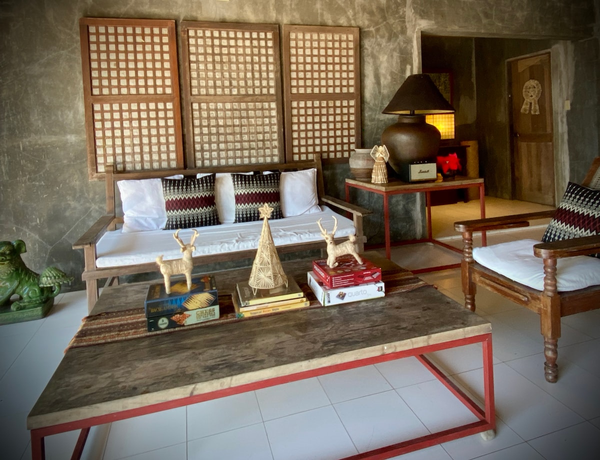 Bahay Sampalok is your home in La Union. This beautiful space is furnished with essential Filipino pieces & modern quirky touches to make your stay cozy & inspiring. We want to share our love of local craftsmanship: dividers made of antique capiz , a terracotta sink made of Taboc clay. A favorite of ours is the solihiya kitchen cart gifted by our neighbors at Irugi Coffee(try the press-o-tonic!). Every morning here you wake to sunlight & a view of our namesake, a beautiful 30 ft. sampalok tree.