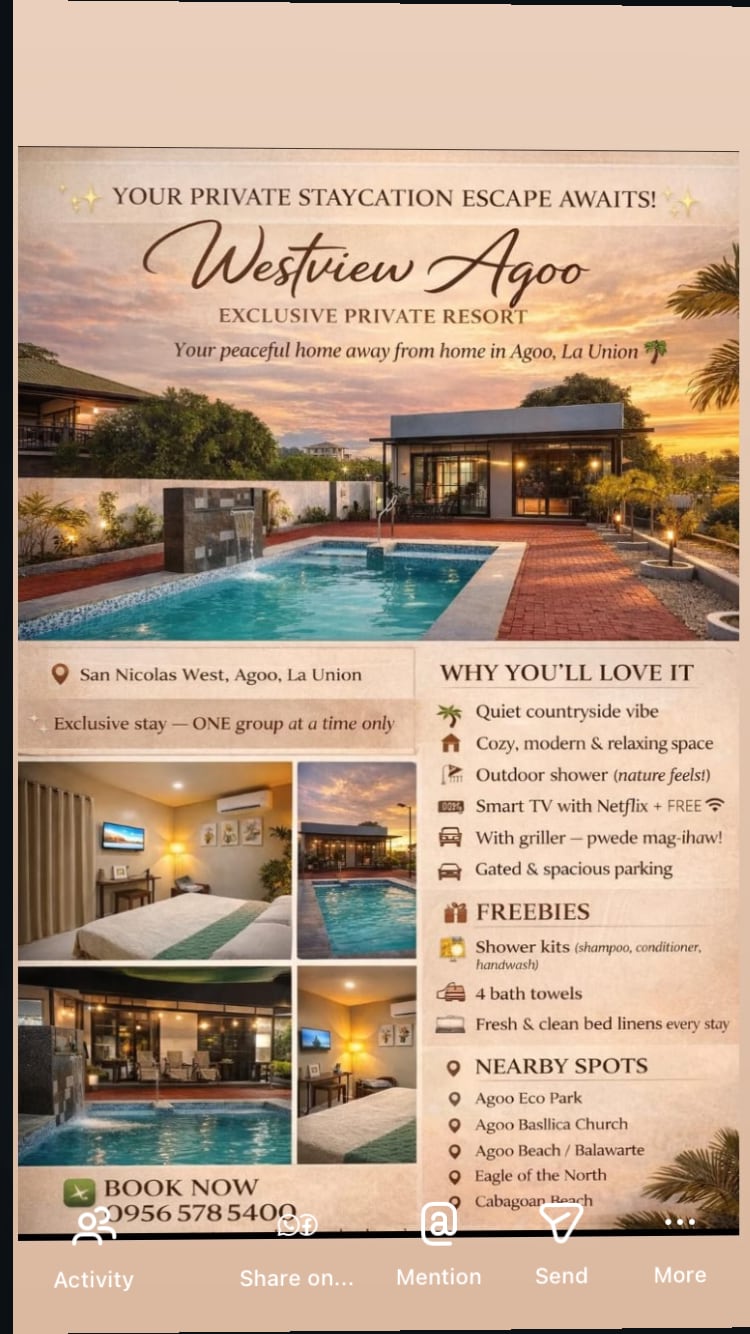 ✨🌅 THIS IS LITERALLY WESTVIEW AGOO 🌅✨ Ang private staycation at event venue na tahimik, presko, at exclusive. Looking for a food event venue good for up to 70 pax with a peaceful countryside vibe? Welcome to Westview Agoo — perfect for birthdays, food events, family gatherings, at barkada celebrations. 🏡 Why choose Westview Agoo? ✔️ Exclusive private property ✔️ One group at a time only — sure ang privacy ✔️ Tahimik, cozy, at relaxing ang atmosphere ✔️ May magandang sunset views 🌅