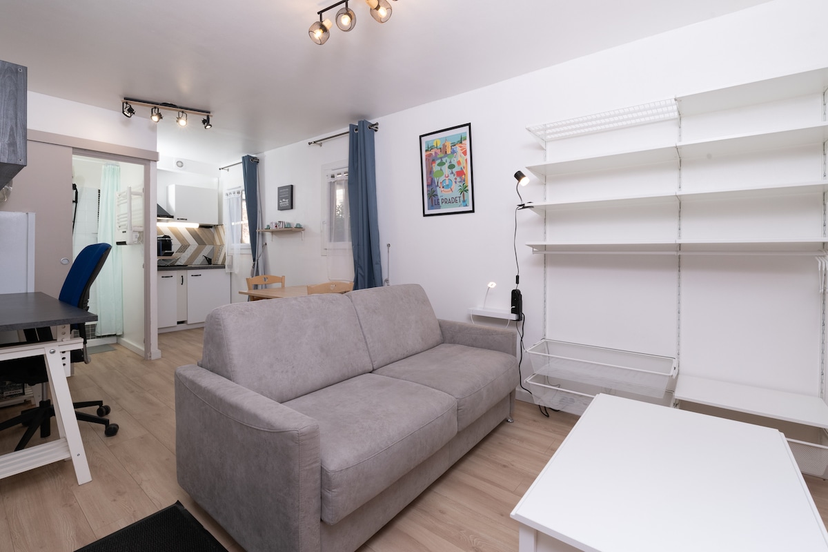Profitez d'un studio moderne neuf qui vous donnera tout le confort nécessaire, douche italienne, toilettes suspendues, cuisine équipée, internet haut débit, Netflix... Jardinet non accolé mais privatif avec salon de jardin et espace barbecue. Situé à 5 min des grands centres commerciaux comme l’avenue 83 plus grand centre commercial à ciel ouvert d’europe et à 15 min des plages entre Toulon et Hyères. Nous nous ferons un plaisir de vous accueillir. Bon séjour dans notre belle région ! 🌞