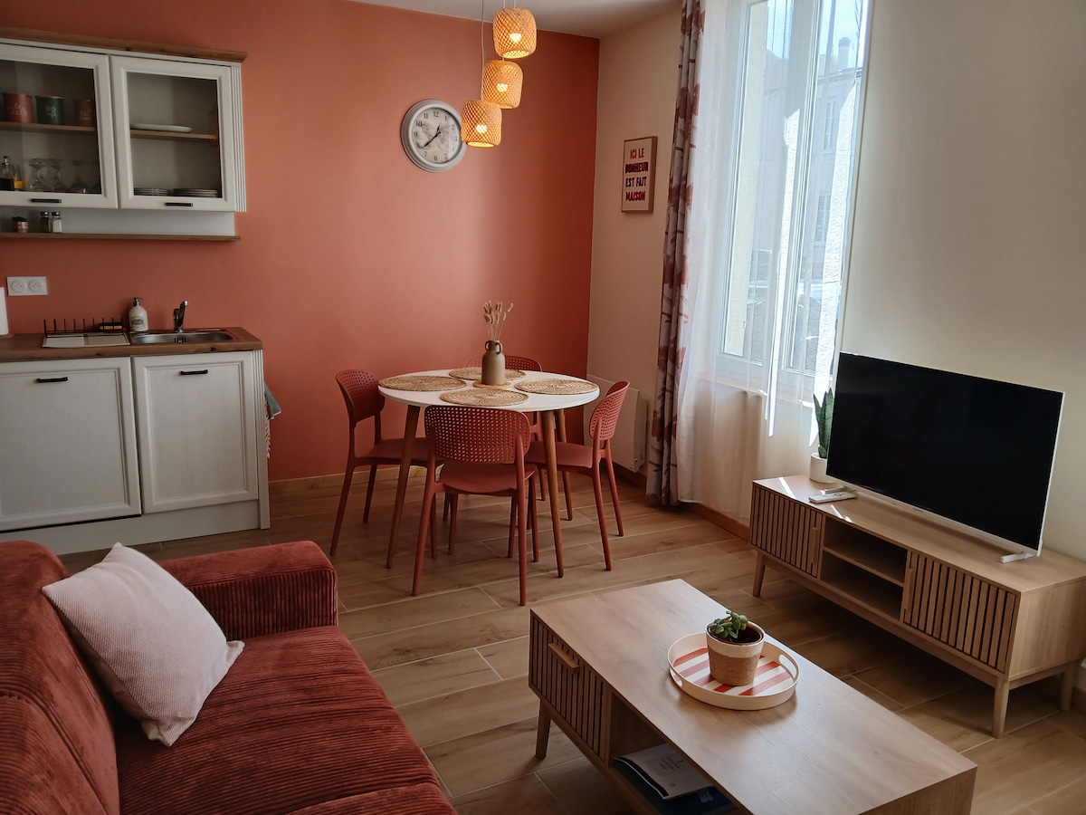 Notre studio de 24 m2, se trouve en hyper centre de Rochefort, à 10 minutes à pieds des thermes, à quelques mètres de la place Colbert et de la corderie Royale. Au RDC, très calme, bien que le studio donne sur la rue. Il est constitué d'une cuisine avec petit lave-vaisselle, plaques à induction, grille pain, bouilloire, Nespresso, frigo avec compartiment congélateur séparé. Le lit (160 x 200) est séparé du reste de la pièce par une cloison décorative. Wifi. Totalement rénové en 2020