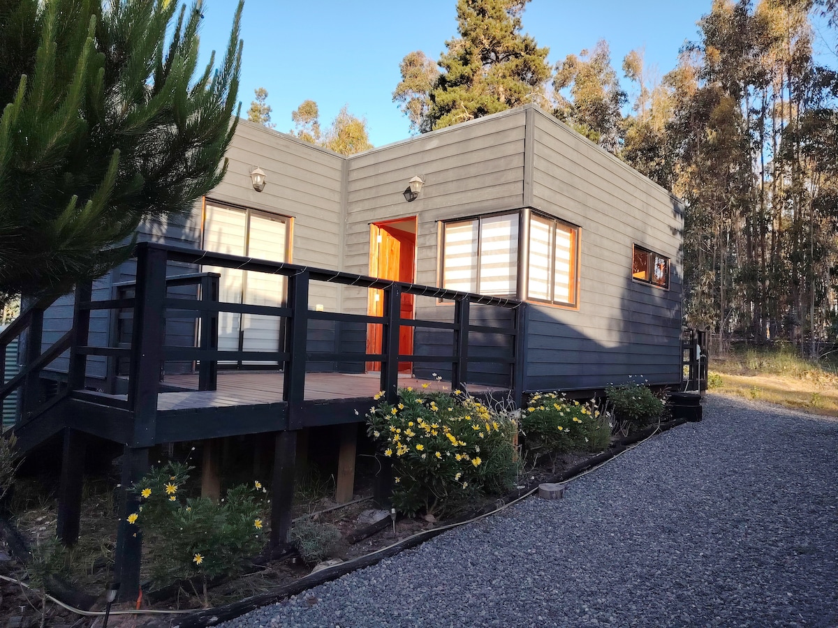 Acogedor refugio de un ambiente (24m2) de diseño único tipo tiny house , inserto en una quebrada nativa con espectacular vista a los valles donde podrás ver una gran variedad de aves . Ideal para escapar de la ciudad y refugiado del viento costero. Amplia terraza con tina exterior caliente y ducha de agua fría . Muy cercano a playas de Matanza y Pupuya. (1cama queen+camita para niños) . Se recomienda 4x4 para días de lluvia - 4,5km de Matanzas - 3.5km de La vega - 24km de Puertecillo