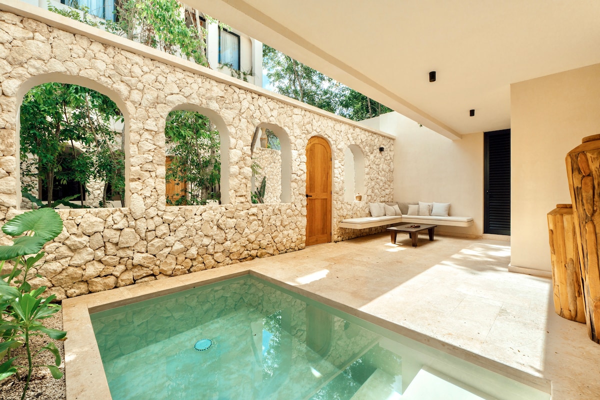 A ground-floor 2BR/2BA apartment in Casa Emilia, inspired by Yucatecan haciendas. Thoughtful design, warm textures, and calm light frame a cozy home with a private backyard and a small front-yard pool to relax. One minute from Calle 7, the area’s most lively spot after the beach zone and a favorite of locals and expats for eating, coffee, and nights out. It offers the perfect balance of energy and quiet comfort, new, inviting, and made for slow Tulum days.