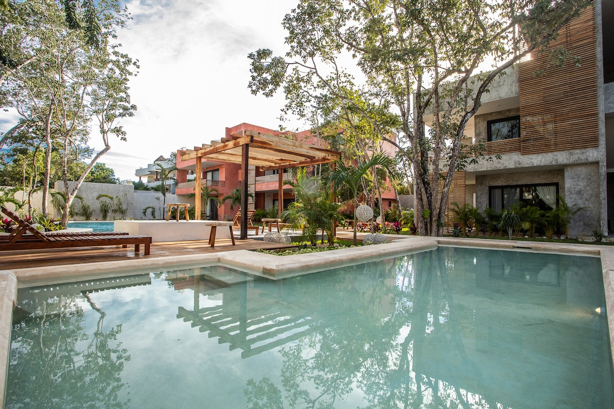 A combination of Italian and Tulun design: dreamy and tropical common area with 2 beautiful pools to chill and unwind peacefully while getting a so longed for Caribbean tan. This comfortable and fully equipped Apartment, a lovely nest to come home to after a long and adventurous day on the beach has everything you might need for a relaxed stay: AC, ceiling fans, WIFI and comfy details all thoughtfully chosen for your most special time in Tulum. Relax and enjoy, we will take care of you! Welcome!