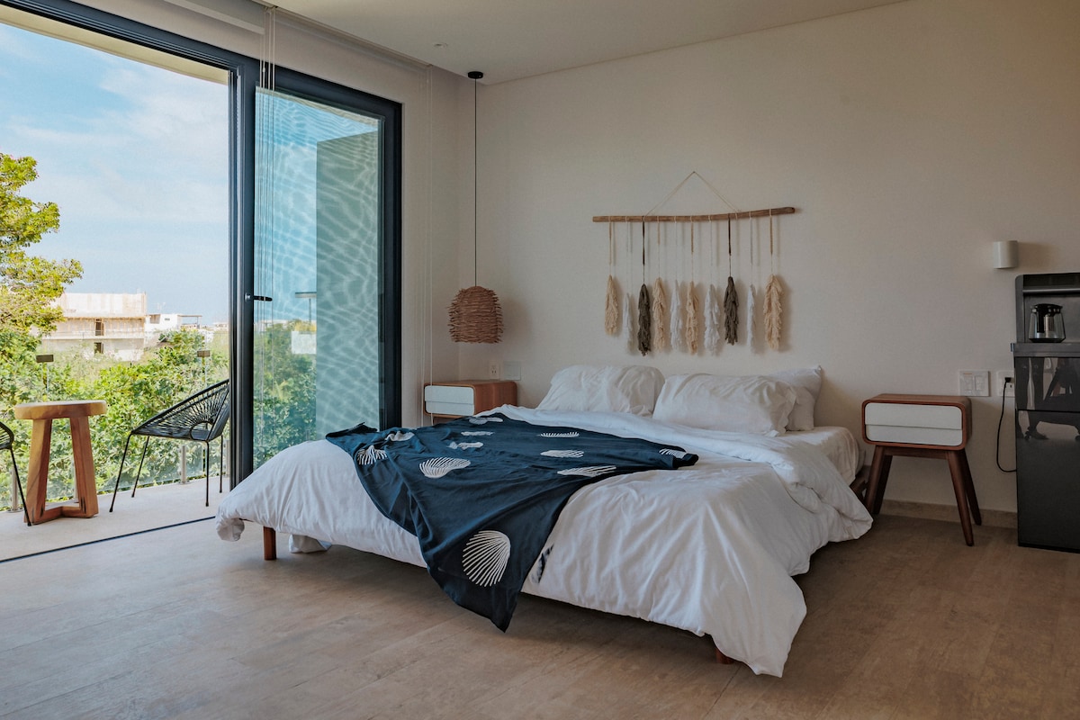 Art beneath 4 walls, but there are no limits within our new 1 BR luxury villa. As part of one of the neighborhood's most luxurious and photo-worthy condos, our 1 bedroom apartment features: ☆ a private terrace featuring a jacuzzi complete with a puff sofa and bridge entrance. ☆ State of the Art boho-Chic decor. ☆ Access to one of Tulum's best condo's amenities, including fully equipped and air-conditioned gym, 2 pools, spa room and co-working rooms. Keep on reading for the full list!