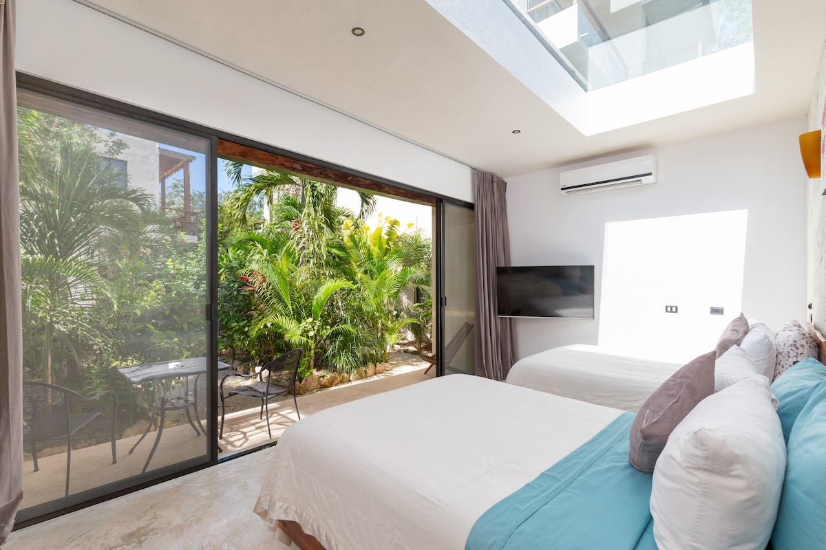 A combination of Italian and Tulun design: dreamy and tropical common area with 2 beautiful pools to chill and unwind peacefully while getting a so longed for Caribbean tan. This comfortable and fully equipped Apartment, a lovely nest to come home to after a long and adventurous day on the beach has everything you might need for a relaxed stay: AC, ceiling fans, WIFI and comfy details all thoughtfully chosen for your most special time in Tulum. Relax and enjoy, we will take care of you! Welcome!