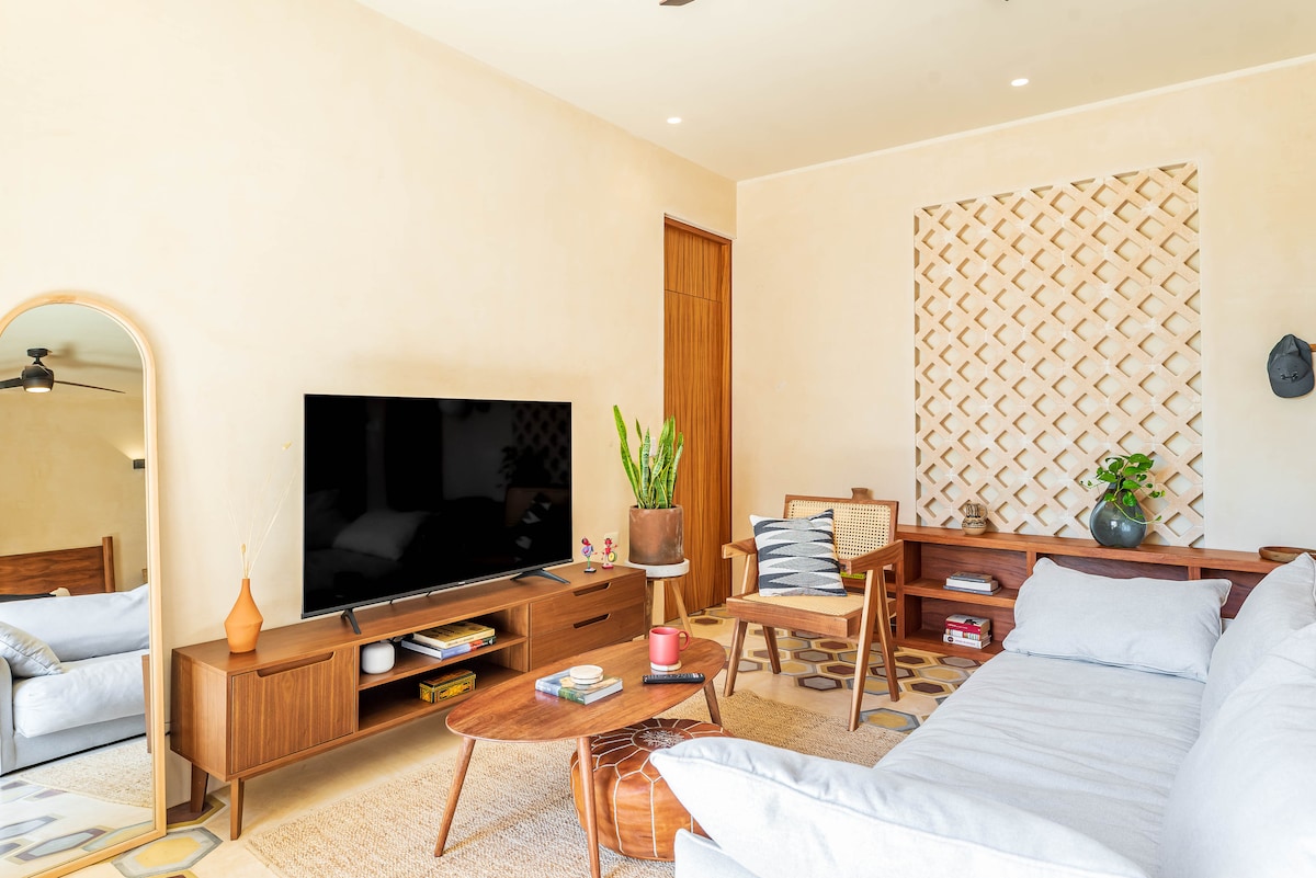Feel right at home and enjoy all the comforts you expect. Fully equipped, this apartment features one bedroom with a full bathroom, a fully equipped kitchen, a living room that opens onto a balcony with a private jacuzzi surrounded by lush greenery. Located in a quiet, new building with only six units, it also offers a lounge area, terrace, pergola, and shared pool. Just a 20-minute bike ride from the beach, it offers many options for living in and exploring Tulum.