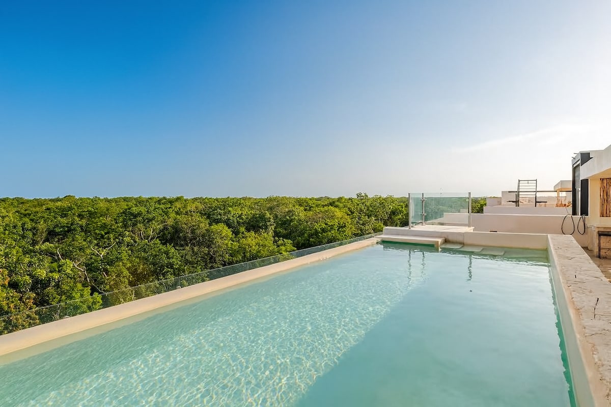 Vive Tulum en su máxima expresión: este penthouse de 2 habitaciones redefine el lujo con dos terrazas panorámicas, plunge pool privada y 3.5 baños. Despierta entre zonas verdes, relájate en la alberca tipo cenote o maravíllate con el atardecer desde la infinity pool. Ideal para nómadas: coworking, WiFi premium, área de ejercicio funcional y comedor al aire libre para cenas bajo las estrellas. Un refugio donde el diseño moderno se fusiona con la magia de la selva. ¡Exclusividad en cada detalle!