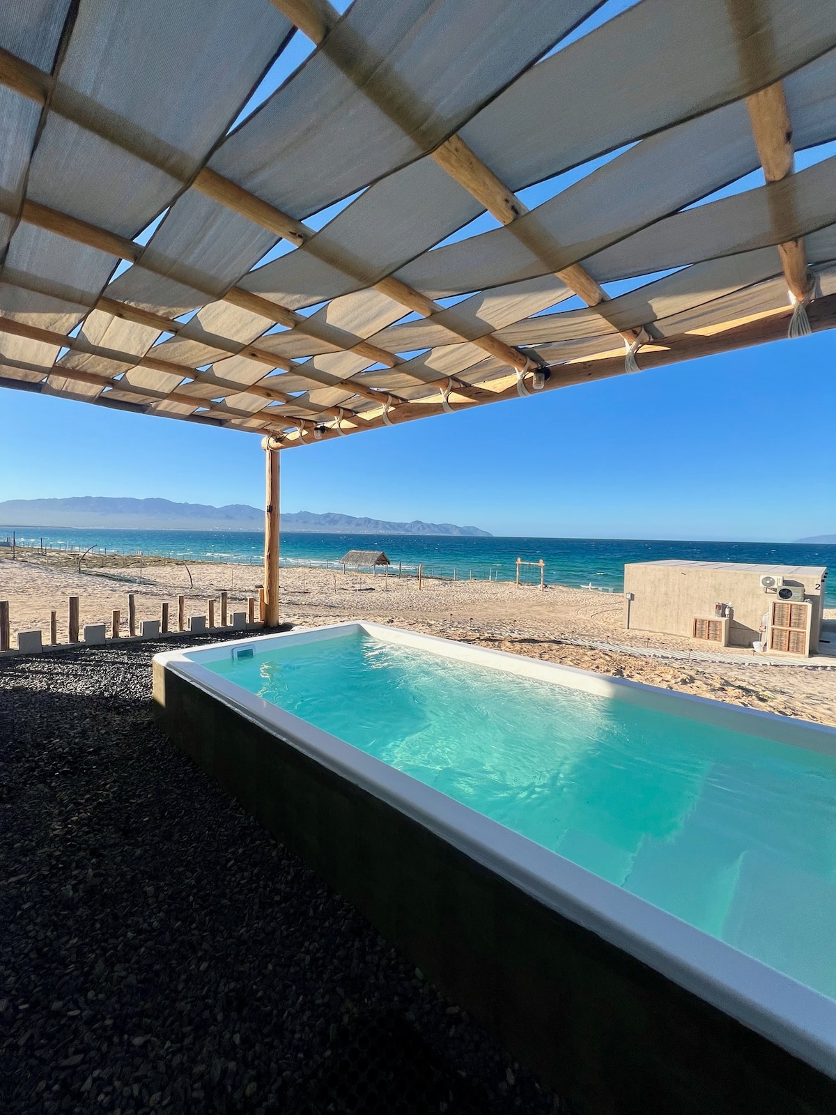 Situated in in the desert 3-4 miles north of town you can definitely relax here! The star-filled sky and waves crashing on shore will comfort you to sleep each night; each Casita has large windows for fantastic views of the ocean,several you can watch the sunrise without getting out of bed! Completely off-grid and eco-friendly we re-use and recycle everything. No crowds and no cars means No noise! the beautiful new Casitas and Glamping tents are just a 3 minute walk to the beach & Hot Springs!