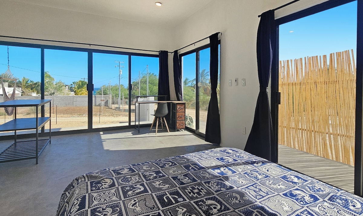 Welcome to Fuego, a 20 m² studio designed to offer both comfort and warmth. The full kitchen, with its fridge, gas stove/oven, and dining bar, is perfect for sharing meals after a day of adventure. Relax on a queen bed designed for luxurious rest, and enjoy the convenience of a private bathroom and easy access to the outdoor shower. With high-speed WiFi, you can work or stream effortlessly, and you're centrally located for beach days, mountain biking, and exploring La Ventana’s nightlife. Fuego