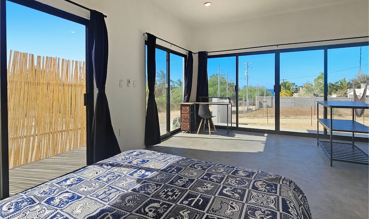 Disfruta de la sencillez de este alojamiento tranquilo y céntrico, ideal para una pareja que viene a disfrutar de las playas y del desierto de La Ventana, a 3 minutos a pie de la playa (PLAYA CENTRAL) a 3 cuadras de la carretera principal. Disfrutarás de un bello amanecer. cuenta con una recamara, TV con Netflix, YouTube, un pequeño closet, un baño, una pequeña cocina con sus instrumentos básicos, un par de sillas cómodas para descansar leer y trabajar, wifi, agua caliente, aire acondicionado