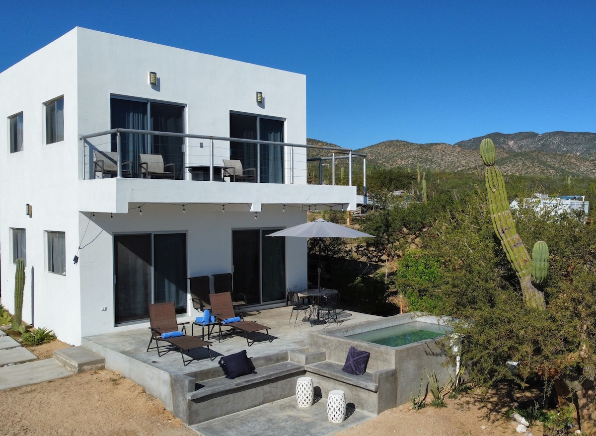 Our 4BR home in El Sargento (3 BR main house and 1 BR Casita) offers breathtaking Sea of Cortez views from its perch atop a bluff. The property extends right down to the beach and includes convenient beachfront gear storage down a meandering private path from the house. The location cannot be beat with easy access to the north trails and the beach. The house also has a newly renovated hot tub on the patio, a brand new hot tub right down on the beach, and a wood fired pizza oven.