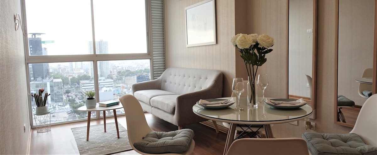 Live Lima from the 20th floor with stunning views! 🛏️ KING bed 📺 65" TV 🛋️ Comfy sofa 🍳 Fully equipped kitchen 🏊 Pool, 🔥 BBQ, and 🍸 Lounge Bar (subject to availability) 🚗 Parking for USD 8/night (subject to availability) 🧳 Store luggage before check-in or after check-out 📍 Prime location between Miraflores, San Isidro, and Surquillo 🌟 With a 4.96 rating and Superhost status, I offer you a comfortable and safe stay. 📅 Book now and enjoy Lima from the top, with style and comfort!