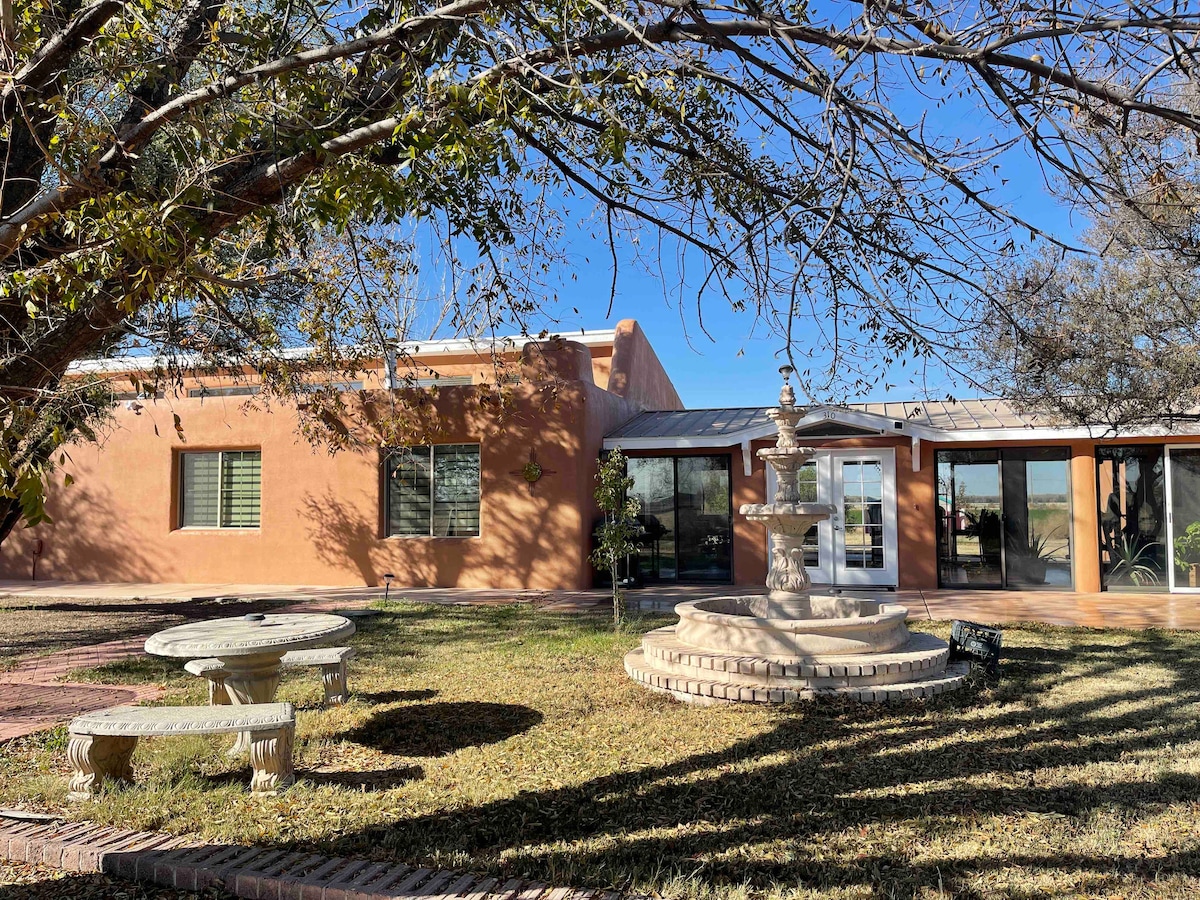 Pueblo Style home on 1+ Acre with Pool! This charming 4BR/2BA Pueblo Style home features stunning details throughout. Gorgeous saltillo tile in the living areas with beautiful wood beam accents, and a kiva-style fireplace for cozy winter nights. The primary suite offers direct access to the covered patio for summer dips in the pool and evening Sunsets. The 4th bedroom is huge and could be used as a second living area. The pool is not heated but will be open and cleaned all year. Sorry no pets.