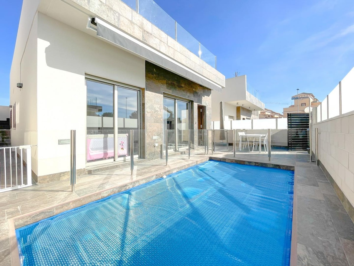 Nyere feriehus i moderne og koselig stil. Ett fullt møblert hjem med fokus på gode senger,dyner,uteområder,møbler og klimaanlegg på alle rom. Det er takparasoll på takterrassen samt parasoll utenfor stuen. Basseng ligger 10 meter fra vår eiendom Huset ligger i et stille og avskjermet boligområde som er barnevennlig. Det er kun eiere av boligene som kommer seg inn med bilen i området. Det er en port på utsiden. Barnevennlig. Kort vei til badestrender, matbutikker, restauranter, golfbaner, etc.