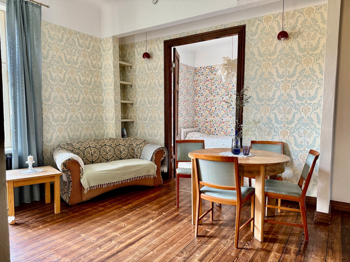 Enjoy your stay in our fully renovated apartment which is just an 8 minute walk from the Freedom Square and Old Town. Free Wifi and free private parking on site. Self check in and out. Our apartment is located in a historic building built in 1889 which is protected by the National Heritage Board. The building and the apartment are fully renovated. It is easy to get around the city center by foot, electric scooters and tram. Cafes, restaurants and grocery stores are close by.