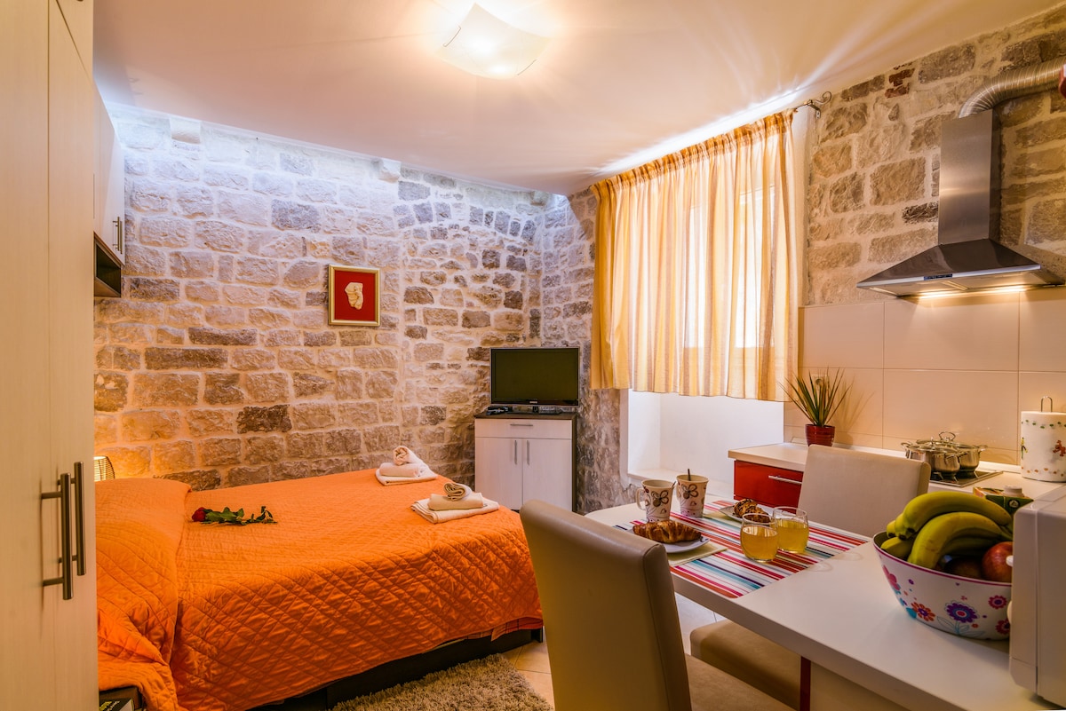 The small room is located on the top floor & offers nice views over the bay of Trogir. You can even see Split in the distance, with Mosor mountain behind it. The Room is perfect for 2 people. Other features of the room are: Kitchenette, AC, 1 small Bathroom and a 43inch Smart TV with Netflix, etc. You can see directly out to the sea while laying down on the bed (180cm x 200cm). The balcony has a nice size. There is a table with 2 chairs and 1 deck chair for tanning.
