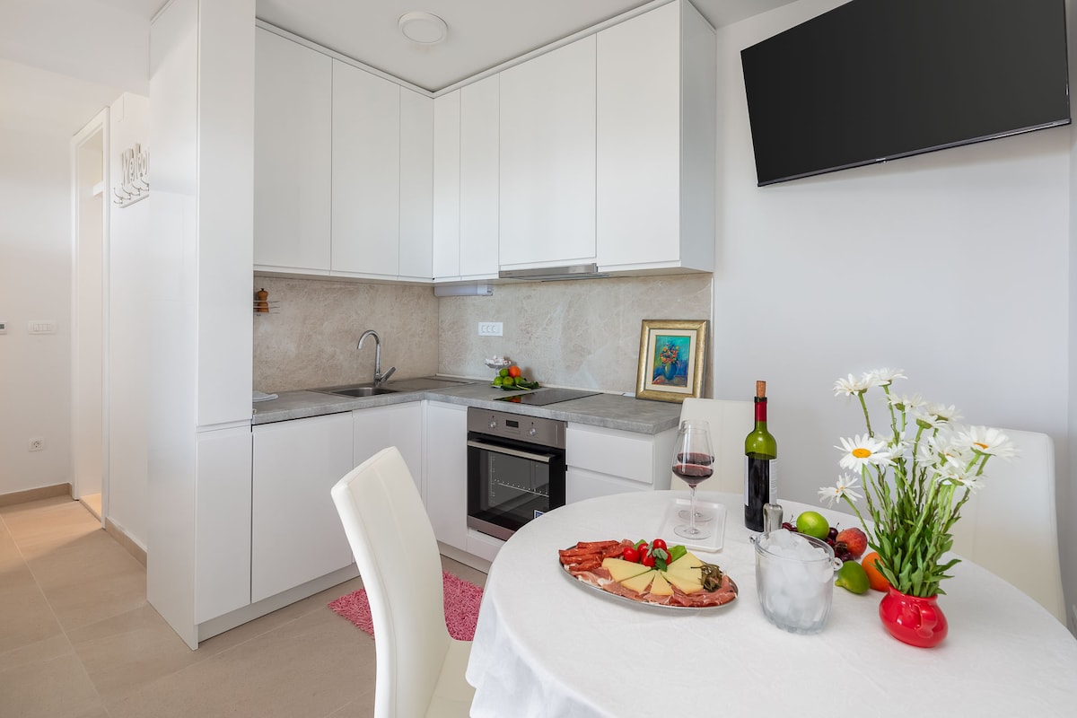 Royal is new, modern & luxury renovated apartment with jacuzzi, 50 meters away from beach. Has 50 square meters and 30 square meters terrace. Comes with 2 bedrooms, a living room, a fully eqipped kitchen with a dining area, bathroom with great shower, barbecue facilities, garage(1 car) , flat-screen TV in every room and free wi-fi. Offers a big terrace with open sea view on surrounding islands. Diving can be enjoyed nearbly. Trogir is 5 km away and Split airport 8 km from the acommodation.
