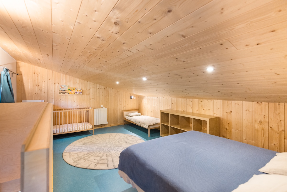 Au sein du Parc des Bauges en Savoie, faisant parti du Gîte des 5 éléments, ce logement spacieux (150m2) et serein vous accueillera en famille ou entre amis. Une forêt (7 000 m2), un jardin potager, les vues sur les Bauges et les Belledonnes, un grand lac à proximité, positionnent ce gîte dans un écrin de nature et d'harmonie. Des prestations, sur réservation, telles que petit-déjeuner, table d'hôte, massage, dégustation de vins bio, traiteur, guide de montagne, vtt, vous seront proposées.