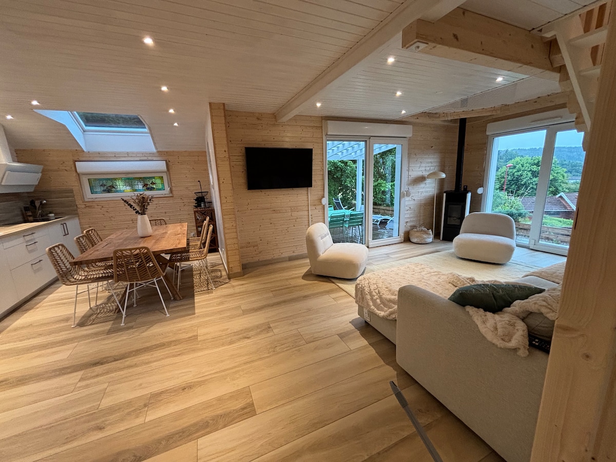Chalet Norvosges is the ideal place for unique moments with family and friends. The chalet built in 2023, is located in a quiet residential area, while being close to city center, the lake, and many forest trails. Designed to accommodate upto 8 people (and a baby) you benefit from a large landscaped garden and playground, stunning views of the valley, a games room and a relaxation area with Jacuzzi heated all year round. Bed linen, towels, wifi, heating and electricity are included in the price.