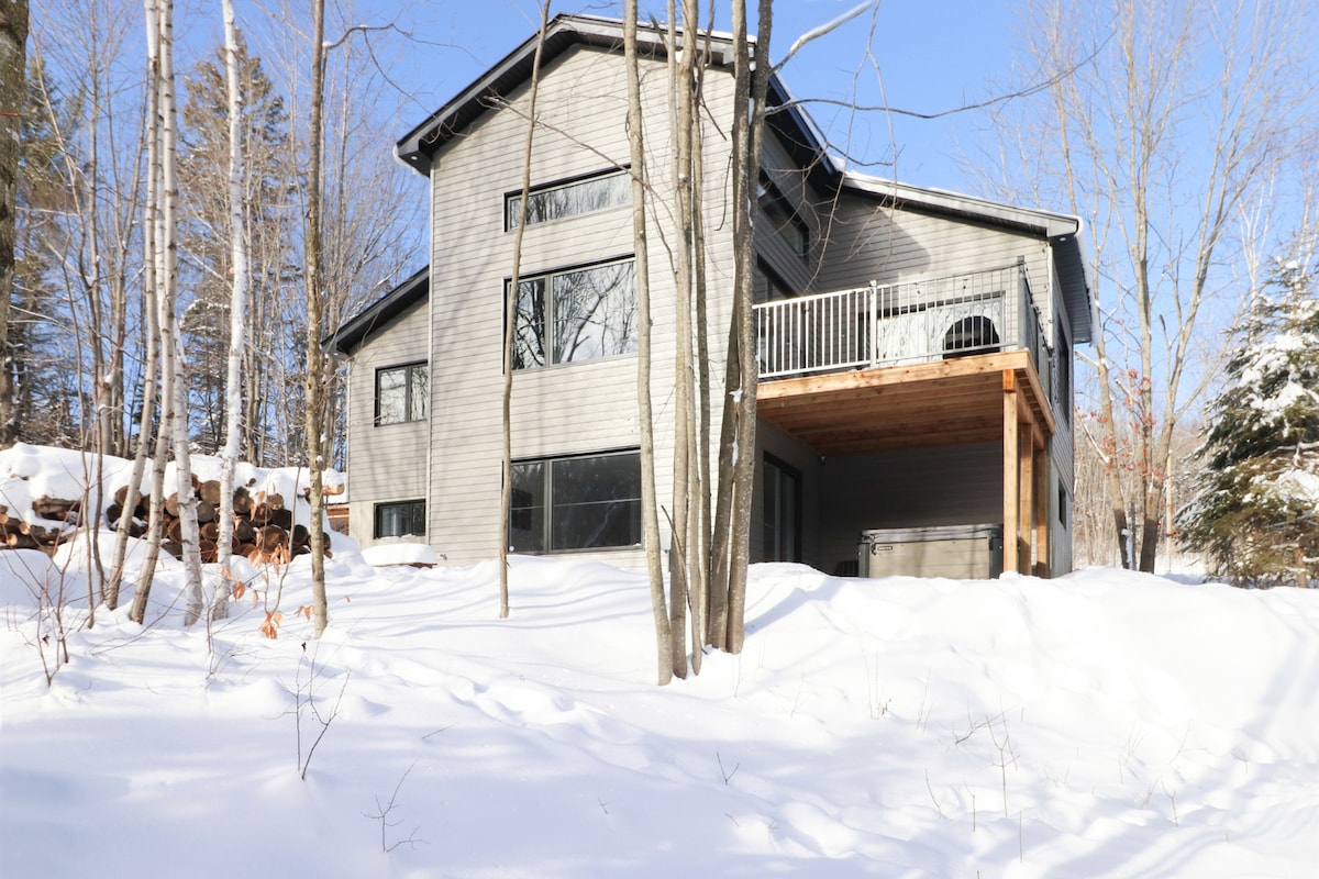 Our Nordic forest chalet is perfect for spending quality time as a couple (or with a kid), or for a work-retreat (with high-speed WiFi). The wooden interior is warm and cozy. The full-height windows offer stunning views over a forested valley. The open-concept kitchen and living room keep you in the conversation while cooking. If you prefer to cook outside, there is a fire pit with a grill and outdoor dining table. Only 70-min drive from Montreal. The lake is a 25-min walk if you park nearby.