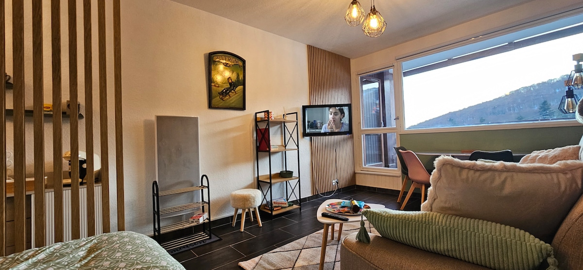 Studio fraîchement rénové pour 4 personnes dans une résidence très calme en plein coeur de la station de super besse. Situé au 2eme étage avec ascenseur et local à ski. Au pied des pistes de ski, du lac et des commerces. Le plaisir de tout faire à pied durant le séjour. Un grand parking se situe juste derrière. Équipé de deux clic clac 140, d'une cuisine équipée avec lave vaisselle et cafetière classique, d'une baignoire. Venez découvrir notre belle région et notre station de ski familiale.