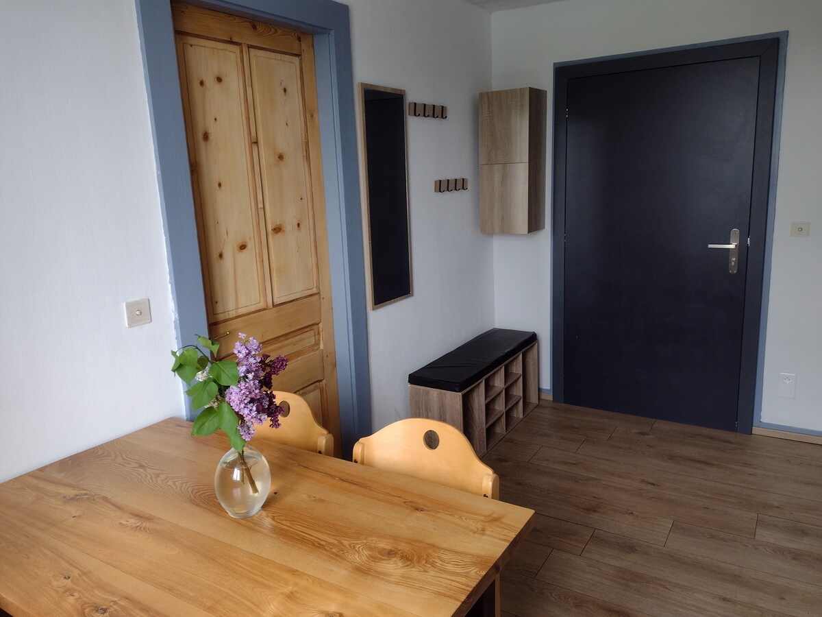 Bienvenue à Morbier, chez Maria et Fabien , Village typique du Parc naturel du Haut-Jura, 15 minutes des Rousses et 50 minutes de Genève. Très proche des stations de ski, la Suisse et les parcours de randonnées. L'appartement de 45 m2 fraîchement rénové , se trouve au RDC de notre maison, avec un accès indépendant. Placée sur un versant de montagne, la maison offre une vue exceptionnelle sur la vallée et sur la Dôle. Les enfants sont rois chez nous !