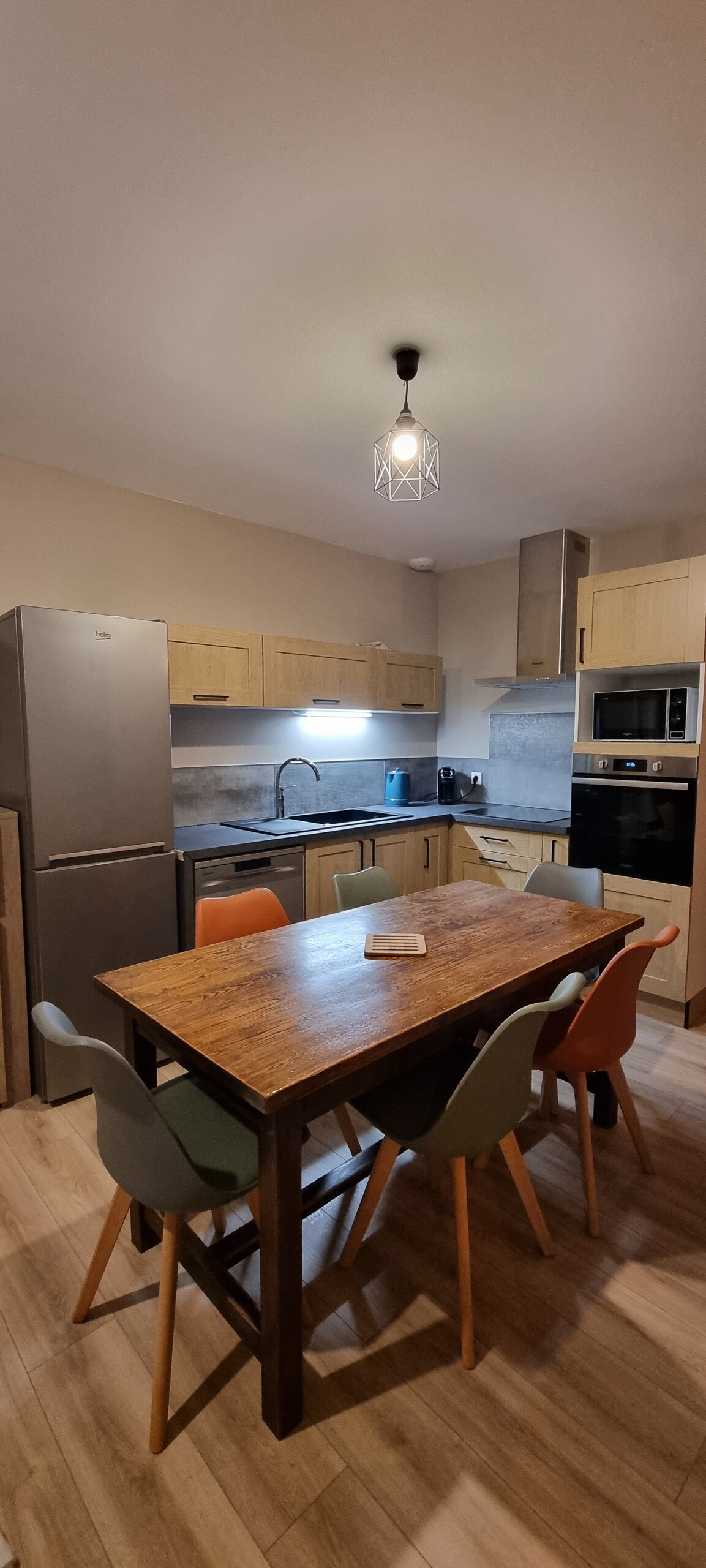 Appt de 65m2 avec terrasse couverte de 20m2, comprenant une cuisine ouverte sur le séjour, un salon avec canapé convertible, 1 salle de bain, 1 chambres avec lit de 140*190 et 1 chambre avec 2 lits de 80*200, local vélo/ski, tout équipé: Lave linge-Lave vaisselle-Micro ondes-appareil à fondue, raclette-TV, DVD–Barbecue-matériel pour bébé-Draps fournis, lits faits à votre arrivée. Linge de toilette pas fourni.