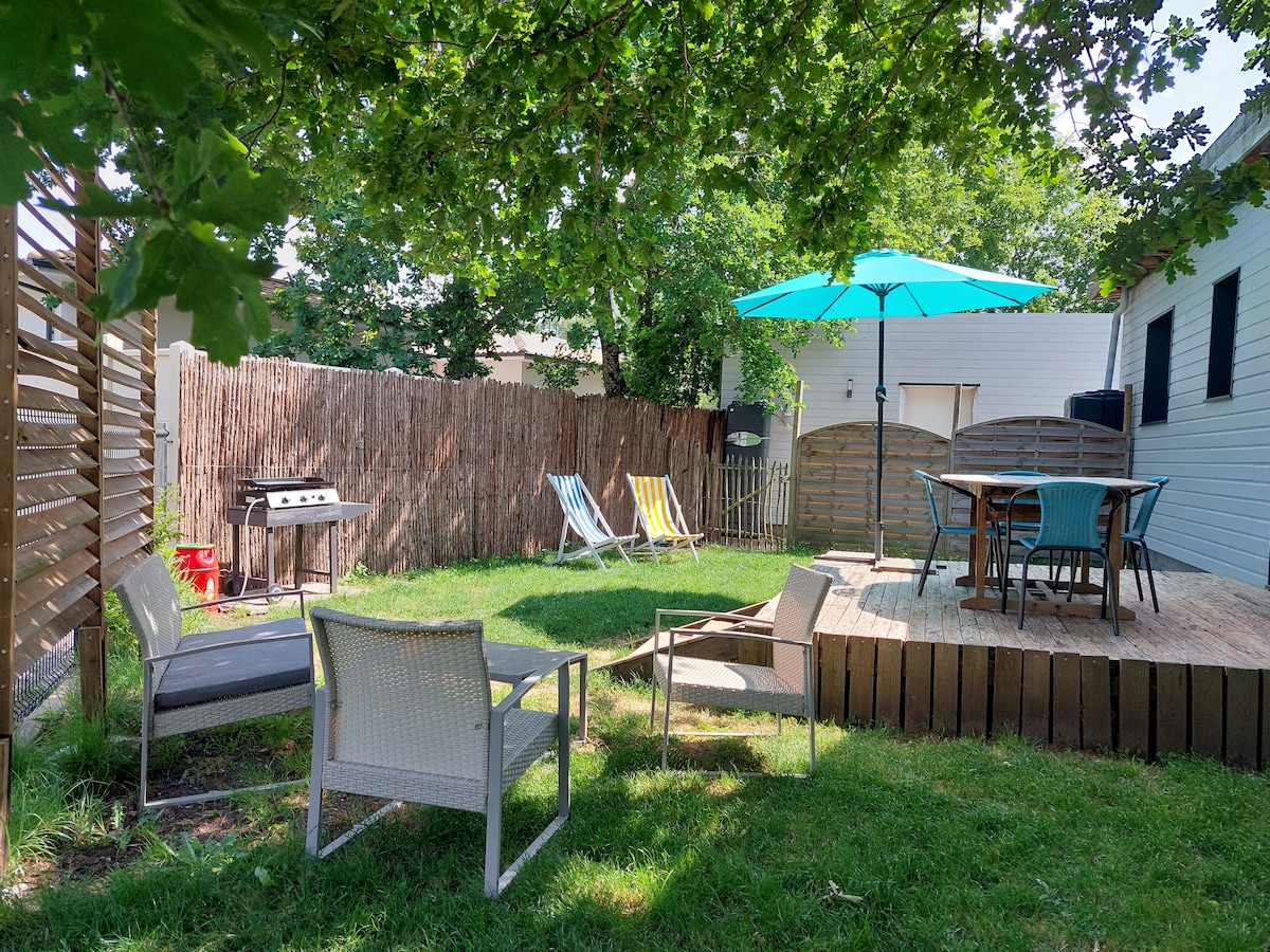 Maison de 42 m2 dans une propriété privé, un espace vert et terrasse. Situé a 3 km du lac et 10 km de l'océan. L' endroit est idéal pour des vacances au calme prés de la nature. Piste cyclable à 800 m vers l'océan ou le lac . Centre ville à 1,5 /2km La Terrasse extérieur avec sa pergola ,le barbecue, transats chaises longue, parasol , fauteuils pour passer des moments agréables et de détentes. Convient aussi à 2 collègues de boulot, car clic clac. Parking privé à l'intérieur de la propriété.