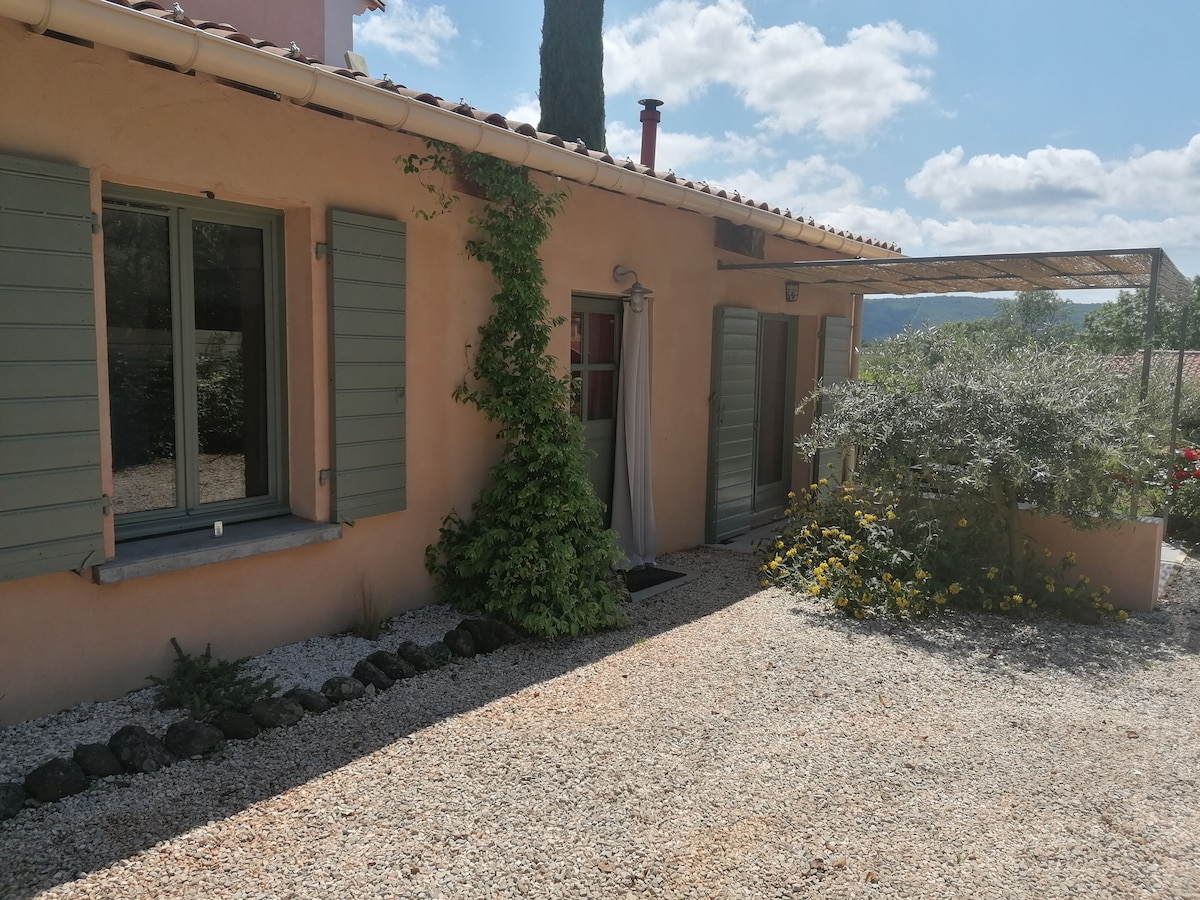 Ouvert à la loc du 30/04 au 30/10.Oasis exotique bassin baignade XXL 300m3 450m2 cascade baignade du 08/06 au 22/09 très calme Chambre chalet rustique 17M2 lit 160 sans vis à vis sur 2° partie de propriété indépendante 1500m2 de pinède vue exceptionnelle sur alentours minimum ustensile cuisine,réchaud camping ,frigo, ,Lavabo.Toilettes sêches et douche extérieures Hamac,transat 2au chalet 2 au bassin)) 2 terrasses deux tables de jardin Chien acceptémais pas dans bassin,10 e à payersur site