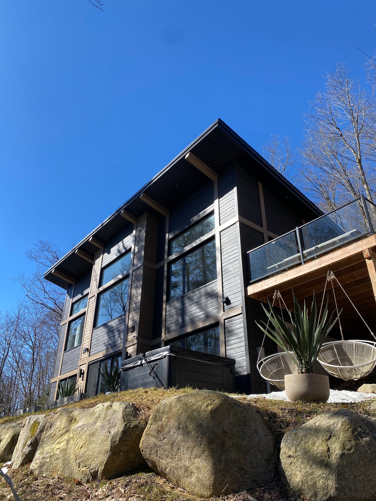 Profitez de l'effet apaisant de la nature en séjournant dans ce chalet contemporain à fenestration abondante en plein coeur de la forêt. Tremblant est magnifique, peu importe la saison. Destination plein air de rêve, vous serez à 8 minutes du Mont-Blanc et 20 minutes du Mont Tremblant. Que ce soit pour la randonnée, le ski de fonds, la raquette ou la motoneige, des sentiers sont accessibles facilement dans toutes les directions. Sans oublier le célèbre P'tit Train du Nord à 3 minutes de route.