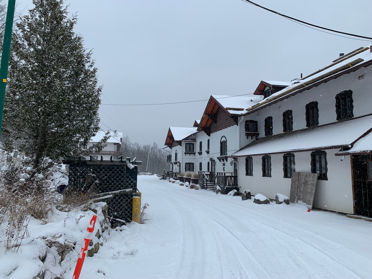Ce magnifique studio de 340 pieds carrés est situé dans le vieux village de Mont-Tremblant. …..Fermeture …..de la piscine le 25 septembre le spa 15 octobre Tout rénové et redécoré, entièrement équipé ( cuisine complète) est parfait pour une escapade romantique! De nombreux restaurants et boutiques ainsi que la plage du lac Mercier se trouvent à moins de 10 min à pied.Le suberbe mont tremblant est à seulement 8 minutes en voiture.ainsi qu' une superbe piscine et spa.