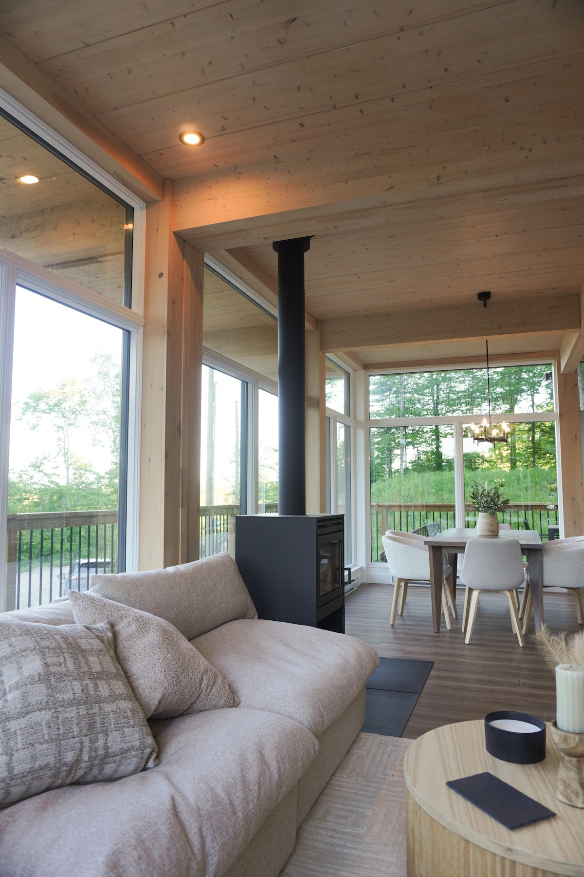Profitez de l'effet apaisant de la nature en séjournant dans ce chalet contemporain à fenestration abondante en plein coeur de la forêt. Tremblant est magnifique, peu importe la saison. Destination plein air de rêve, vous serez à 8 minutes du Mont-Blanc et 20 minutes du Mont Tremblant. Que ce soit pour la randonnée, le ski de fonds, la raquette ou la motoneige, des sentiers sont accessibles facilement dans toutes les directions. Sans oublier le célèbre P'tit Train du Nord à 3 minutes de route.