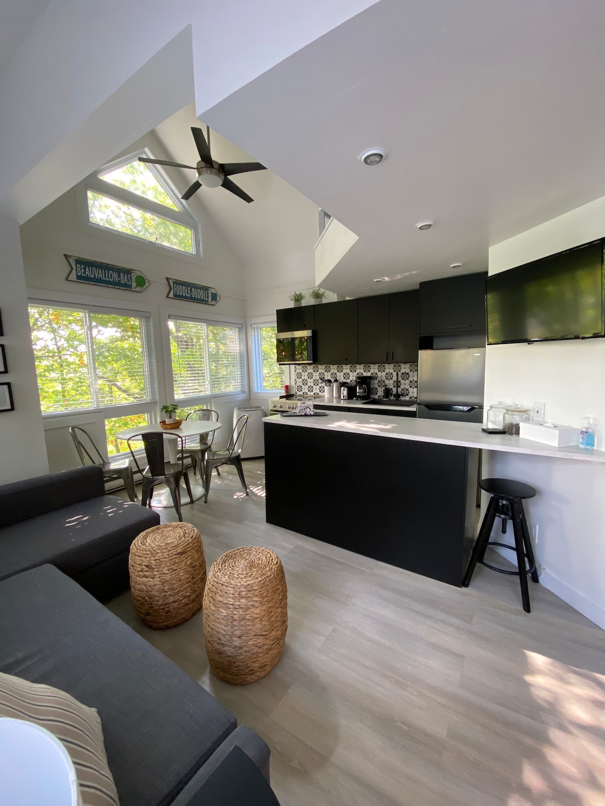Welcome to La Khabine! This cozy, modern cabin comes with all you need to relax and connect with nature. Enjoy a glass of wine with the sound of a crackling fire in the wood burning fireplace. Take in the view of the forest through the surrounding floor to ceiling windows. Relax in the private outdoor cedar barrel sauna. Natural self-care products, firewood, laundry soap, and high-speed Wi-Fi are all complimentary. We hope you'll love our little cabin of windows as much as we do :)