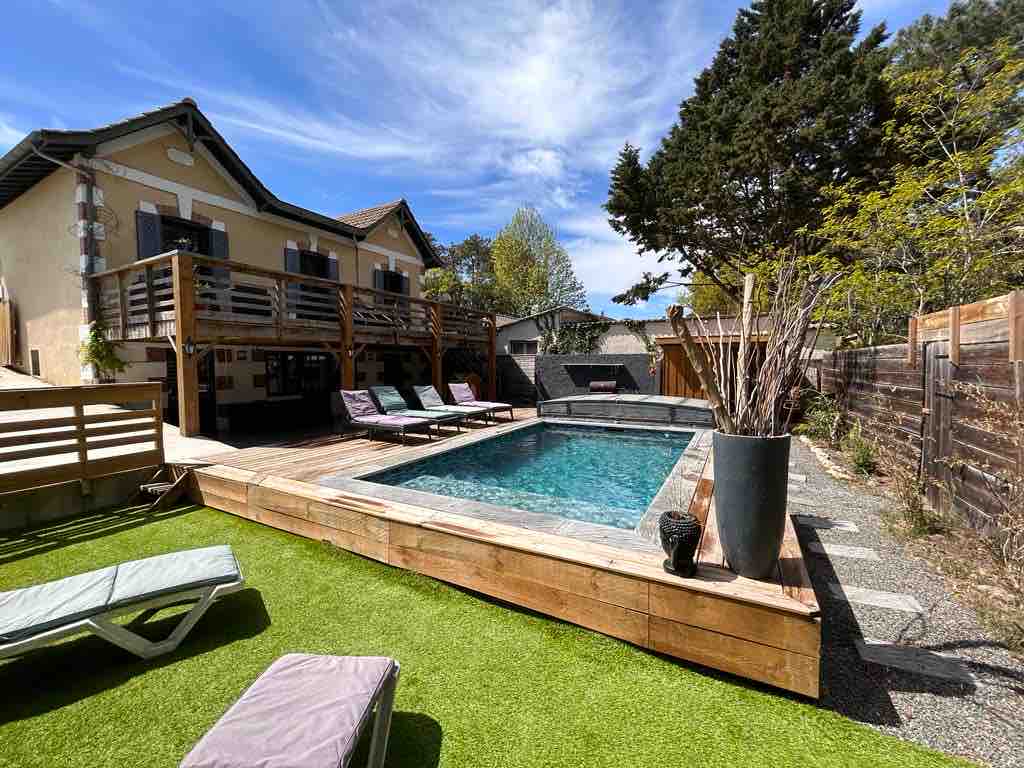 The private wooden HOUSE welcomes you on a small hill in Lacanau-Ocean. In a few steps, you can reach the beach (400 m), the supermarket (300 m) and various restaurants, bars, etc. - while the car takes vacation on the private parking. The "5 star furnished" house offers about 120 m² of space for 8 persons. The wooden terrace with its large BBQ invites you to grill, and the Hot Pot and sauna offer relaxing evenings under the starry sky.