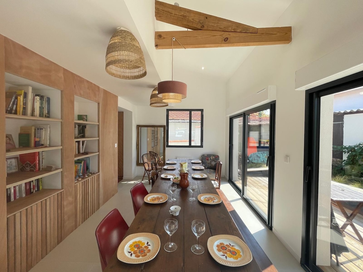 À 100m de la plage, ce logement lumineux de 85m² entièrement refait à neuf par un architecte, est idéalement situé au coeur de Lacanau Océan. Cet appartement décoré avec le plus grand soin possède 2 chambres, 2 salles de bain et dispose de 2 lits et d'un canapé-lit (jusqu'à 5 personnes). maximun Il est idéal pour les familles où les groupes d'amis. Wi-Fi, Netflix, place de parking, ventilateurs.. Tout y est, vous allez vous y sentir comme chez vous !